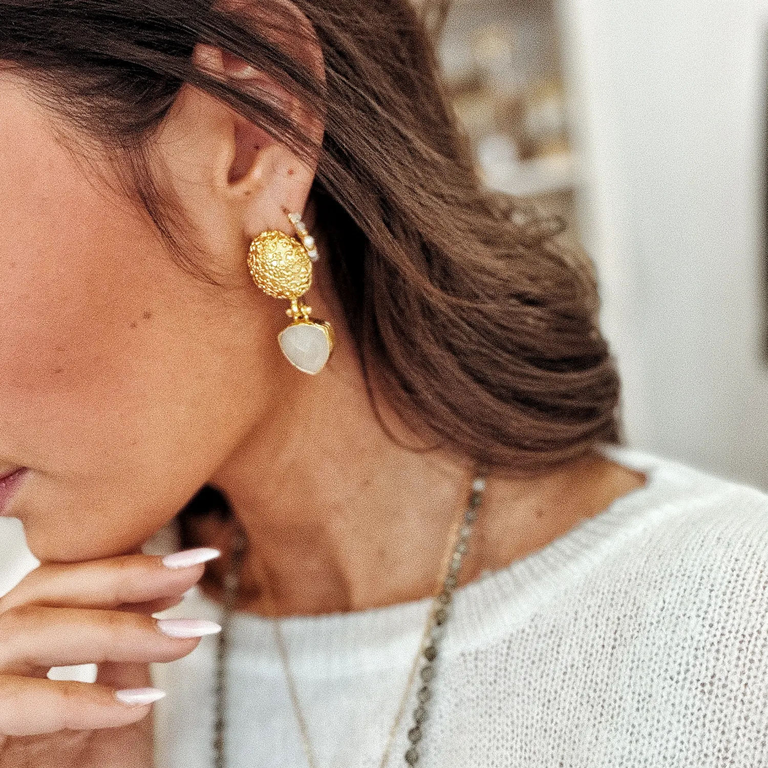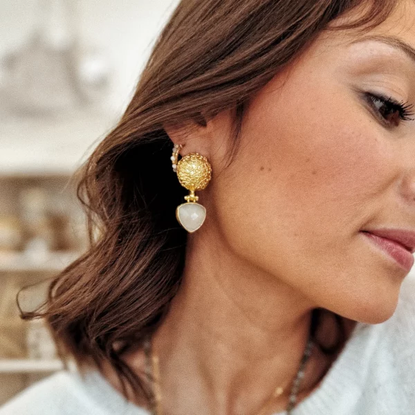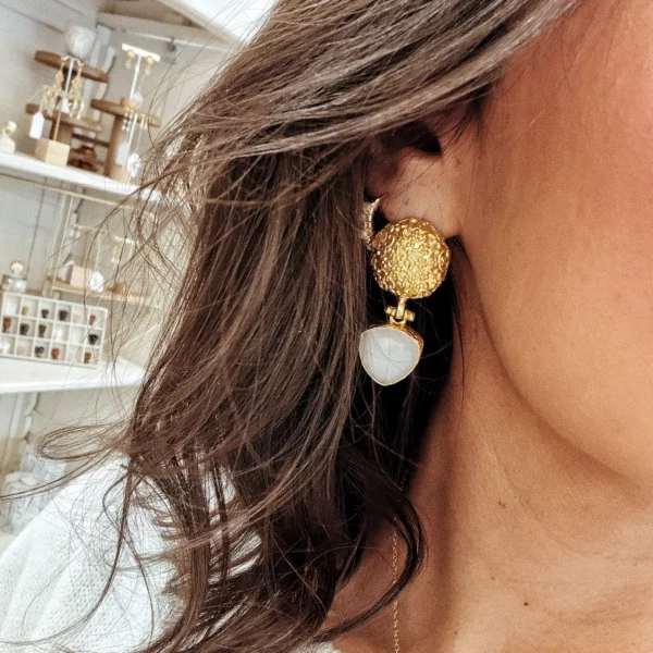 Boucles d’oreilles en plaqué or 22 carats et pierre naturelle de calcédoine blanche.