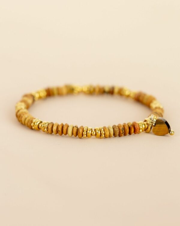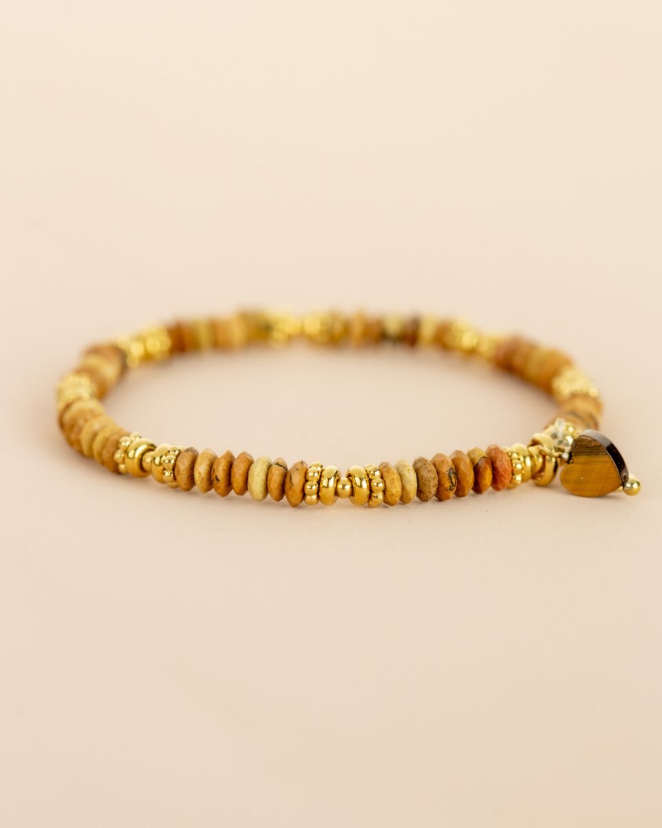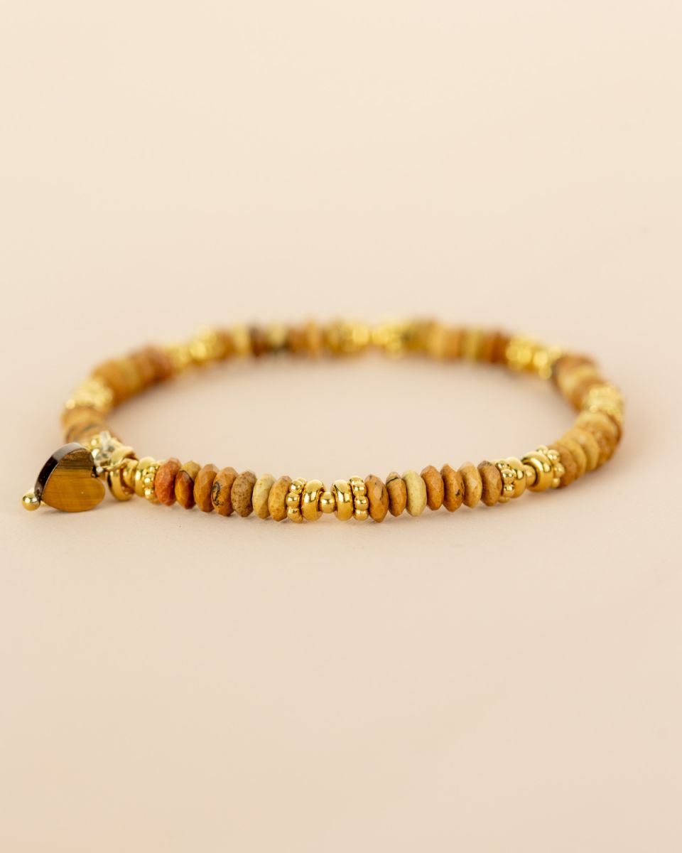 Ce bracelet délicat est composé de perles légèrement facettées en pierres naturelles, qui captent la lumière et révèlent de subtils reflets au poignet. L’association de jaspe paysage (picture jasper), jaspe rouge, jaspe orange, grenat et pierre de soleil crée un mélange harmonieux de tons chauds et naturels.