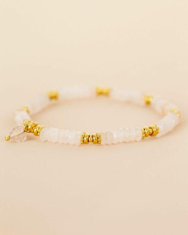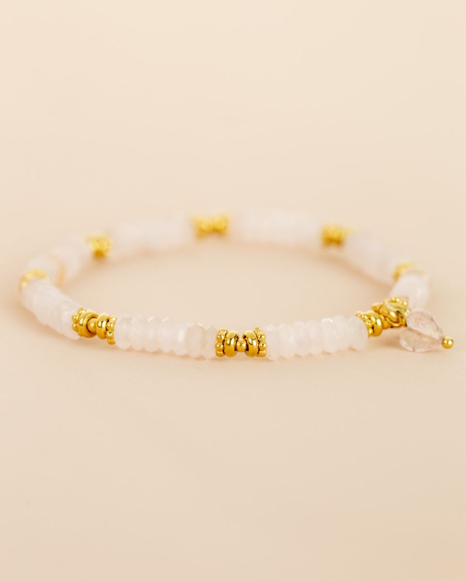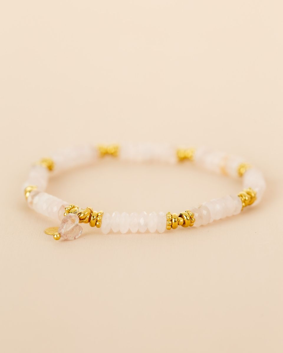 Ce bracelet délicat est composé de perles légèrement facettées en quartz rose, une pierre naturelle reconnue pour sa douceur et ses teintes rosées lumineuses. Les facettes captent subtilement la lumière et apportent une touche élégante et raffinée au poignet.