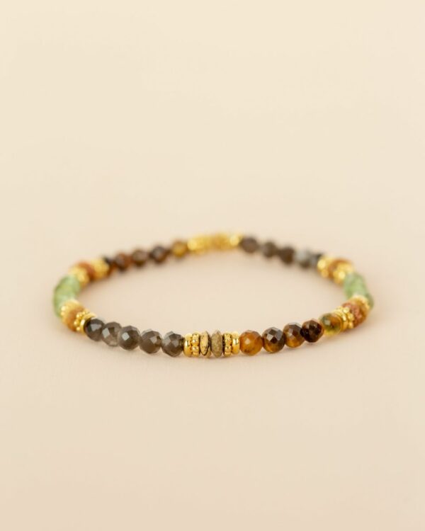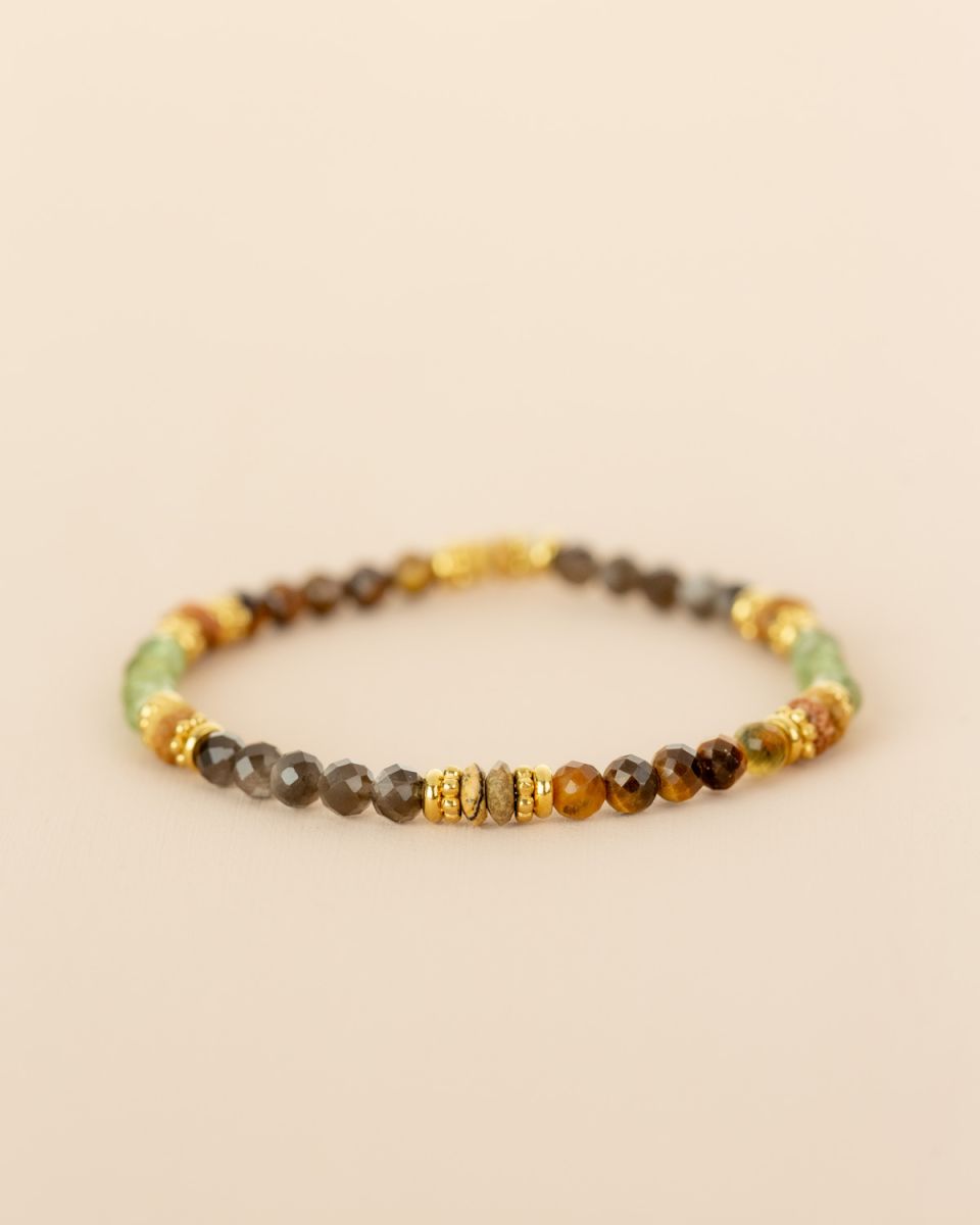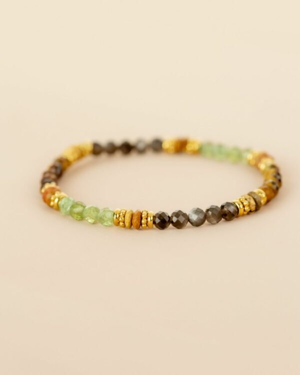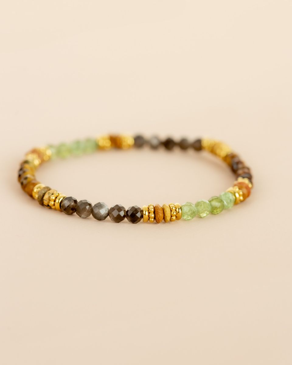 Ce bracelet délicat est composé de perles légèrement facettées en pierres naturelles, qui captent la lumière et révèlent de subtils reflets au poignet. L’association de tourmaline verte, péridot, jade canadien, œil de tigre et obsidienne crée un mélange harmonieux de teintes profondes et naturelles.