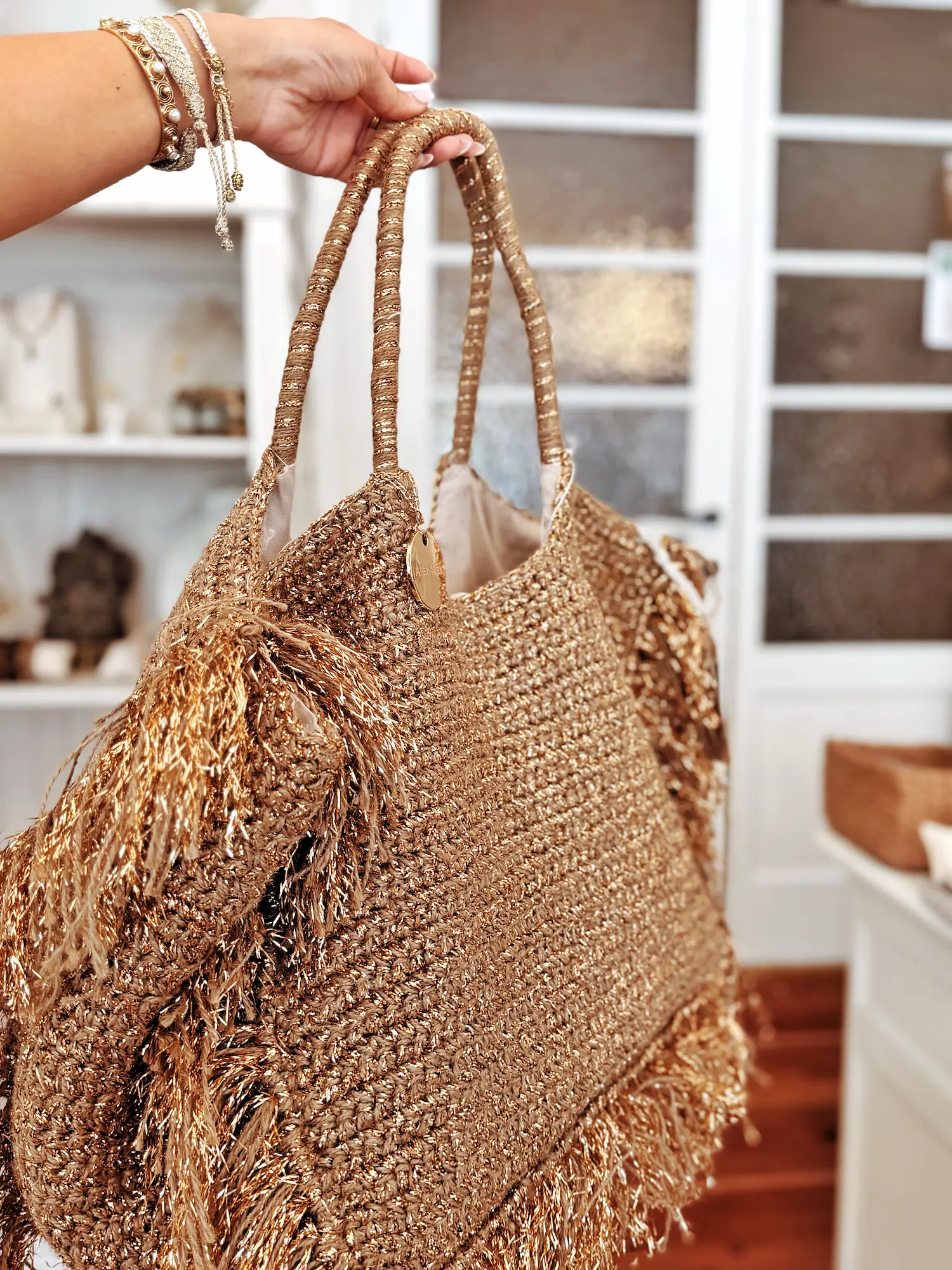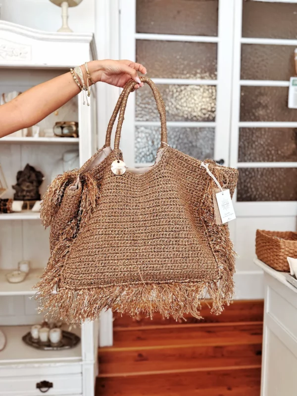 Ce cabas tressé séduit par son allure lumineuse et sa texture délicatement travaillée. Les franges généreuses qui l’entourent lui donnent du mouvement et une élégance naturelle, tandis que ses anses solides permettent de le porter confortablement à la main ou à l’épaule.
