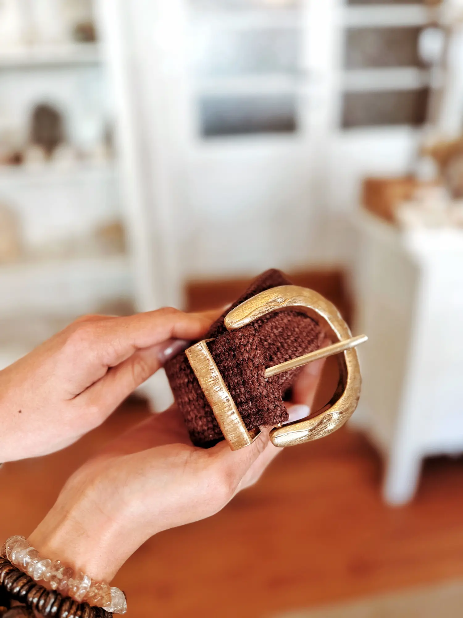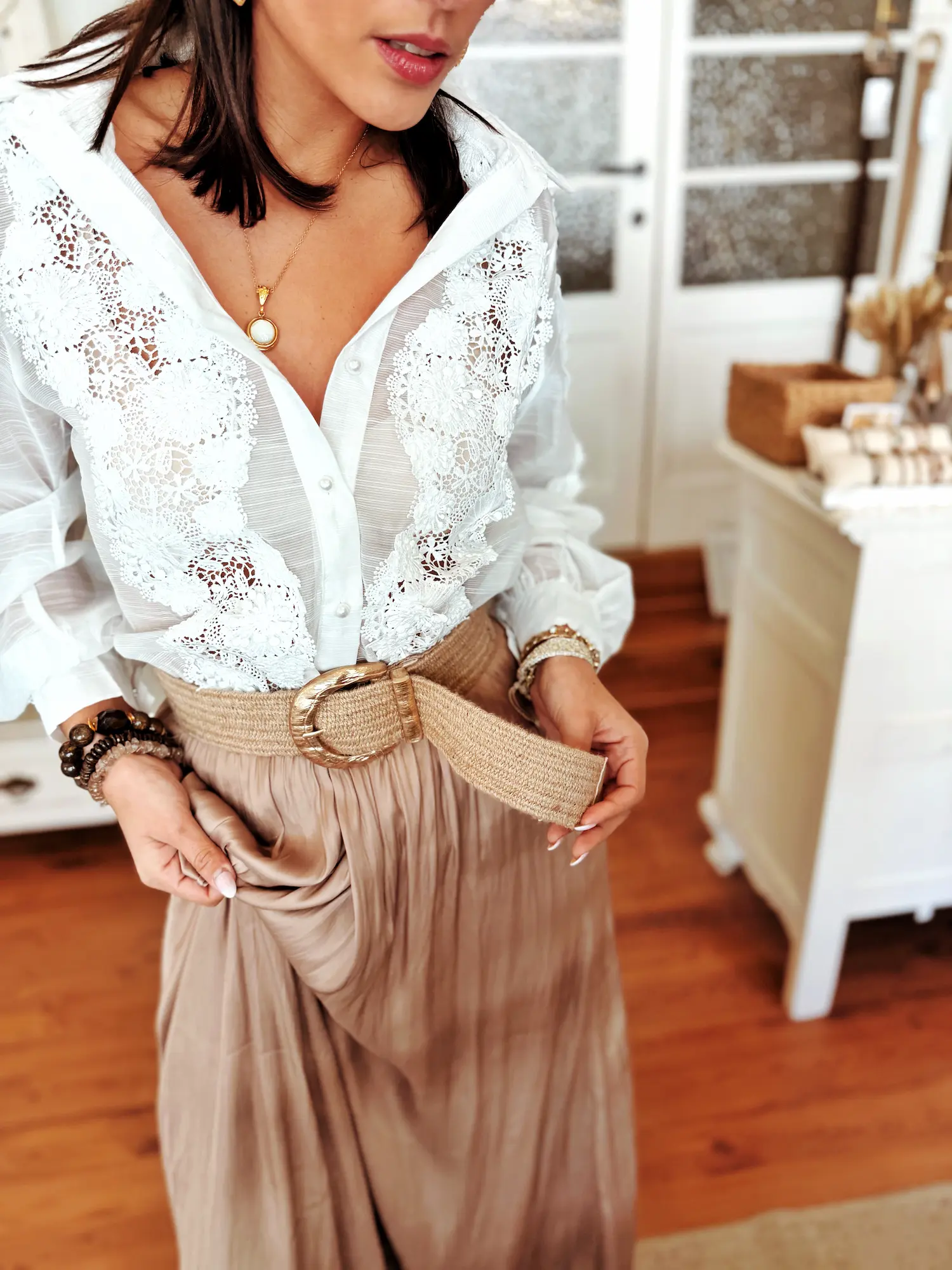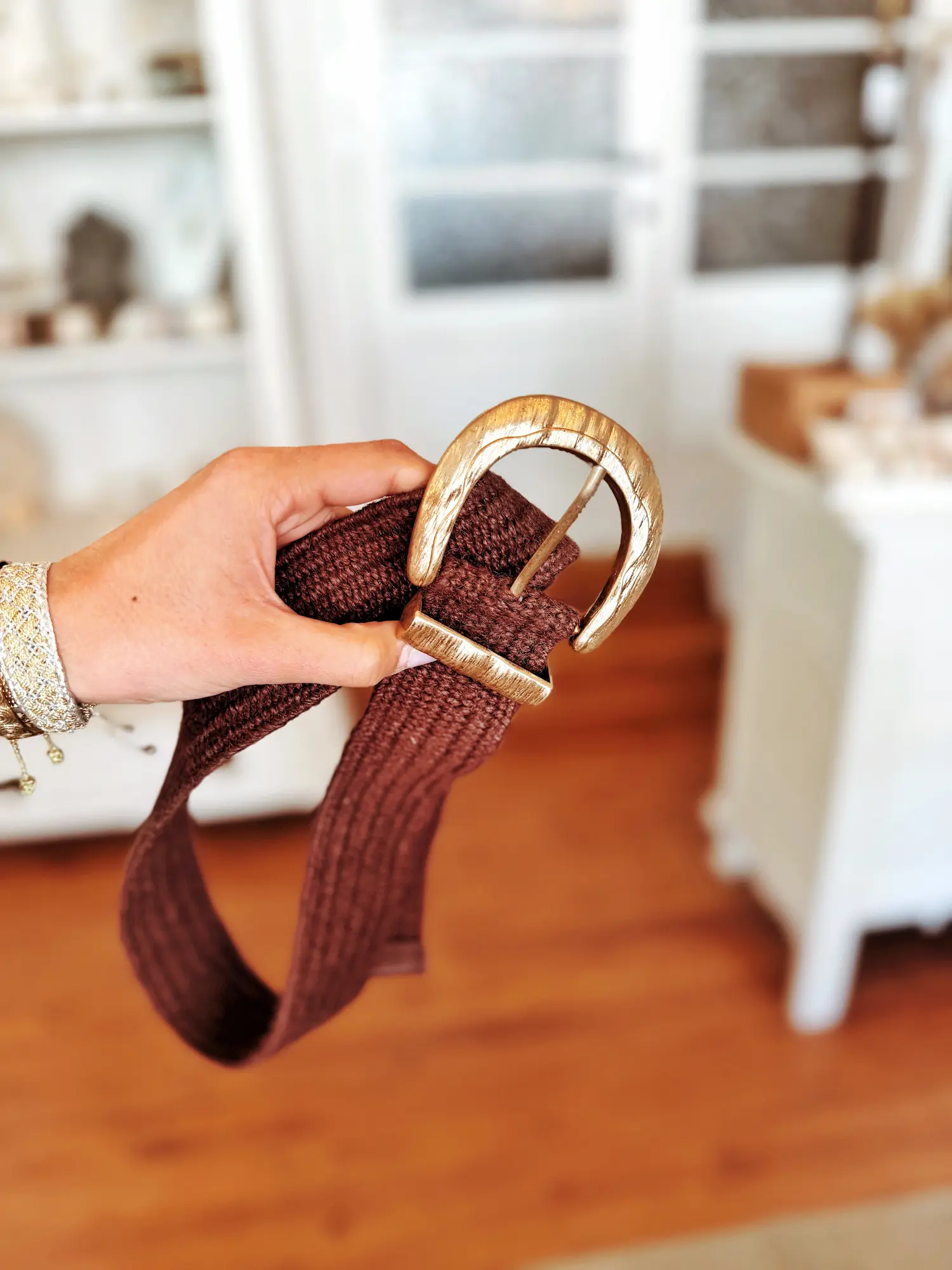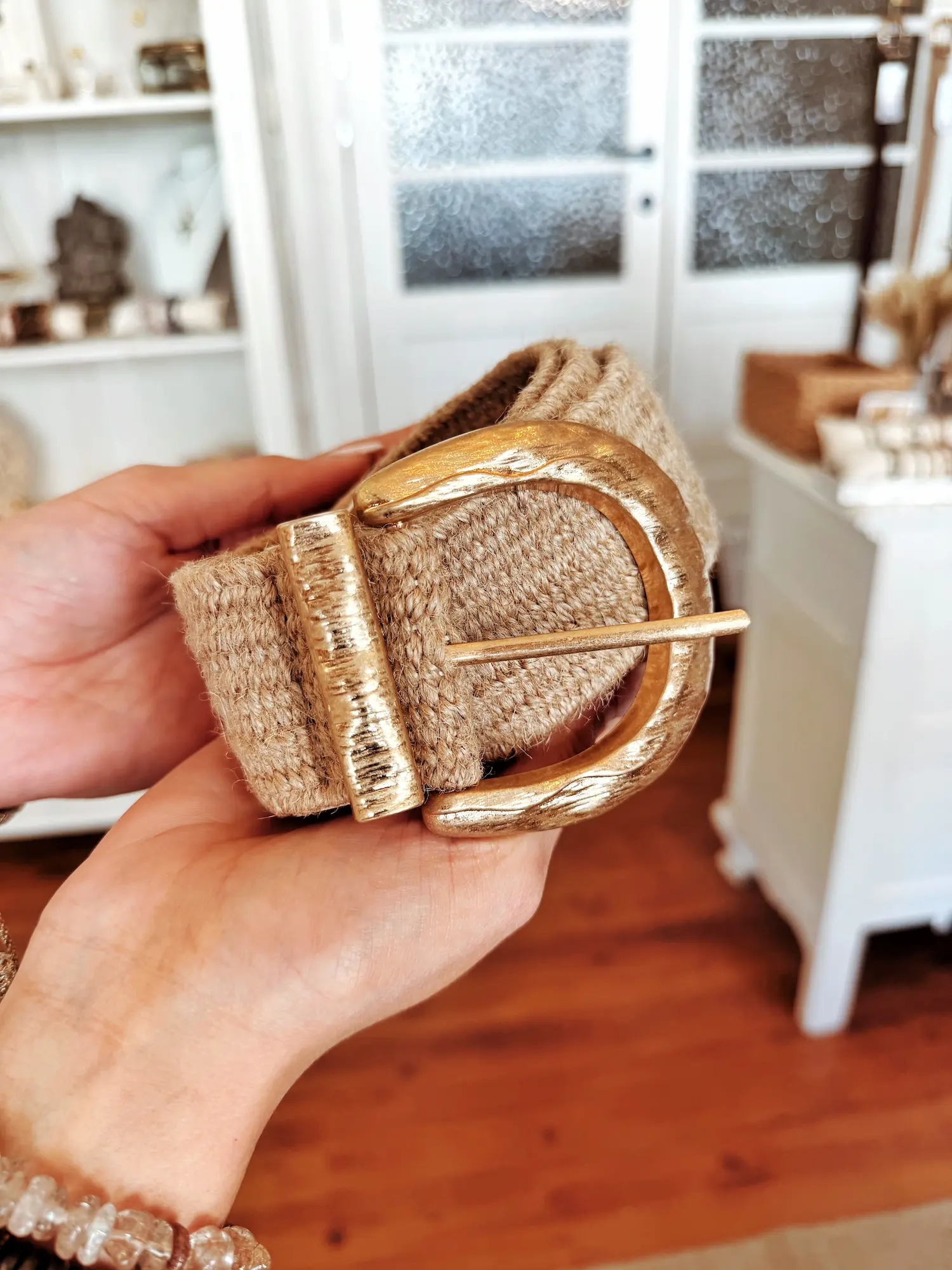 Cette ceinture en jute séduit par son style naturel et élégant. Sa matière tressée apporte une belle texture artisanale, tandis que sa superbe boucle dorée martelée attire subtilement le regard et ajoute une touche lumineuse à la silhouette.