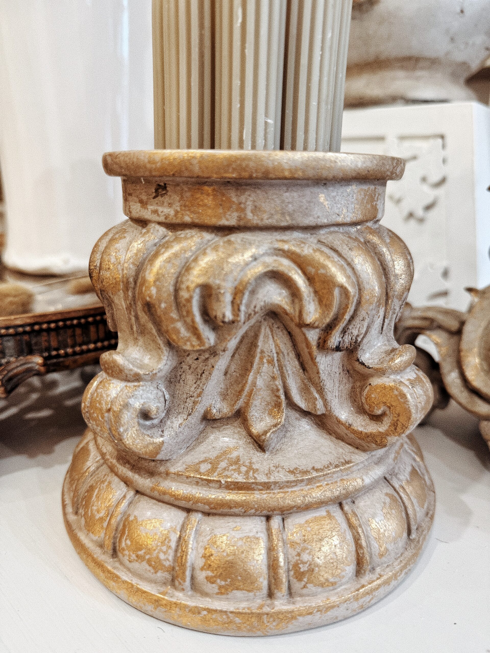 Idéal pour apporter une note élégante et chaleureuse à votre décoration, ce chandelier de style baroque séduit par sa silhouette plus compacte et sa base plus large qui lui donne une belle présence. Sa finition beige patinée, délicatement soulignée de reflets dorés, évoque le charme des objets anciens et s’intègre facilement dans un intérieur raffiné, sur une table, une console ou une étagère.