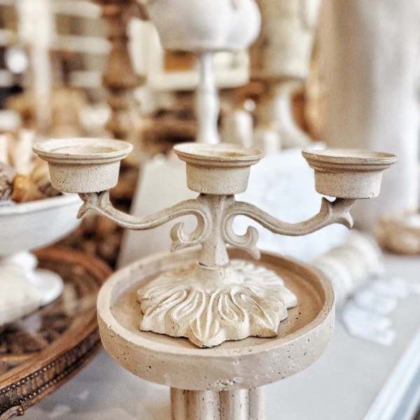 Accueillant trois bougies, il diffuse une lumière chaleureuse et crée une atmosphère intime, presque hors du temps.
