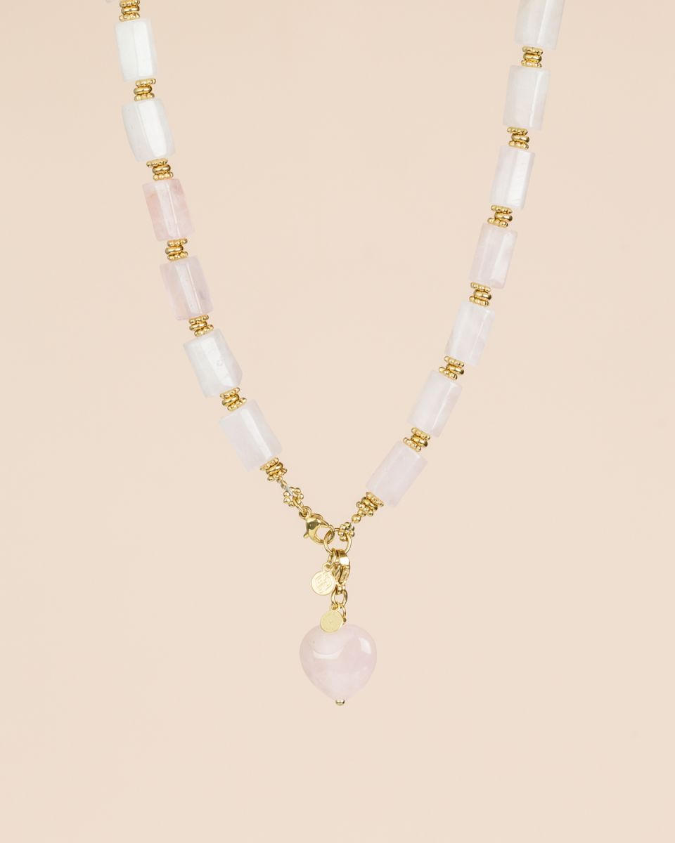 Ce collier délicat est composé de pierres de quartz rose taillées en forme de petits cylindres, révélant de douces nuances rosées. Au centre, un pendentif en forme de cœur vient apporter une touche symbolique et élégante. Le charme peut être retiré si souhaité, permettant de porter le collier dans une version plus épurée.
