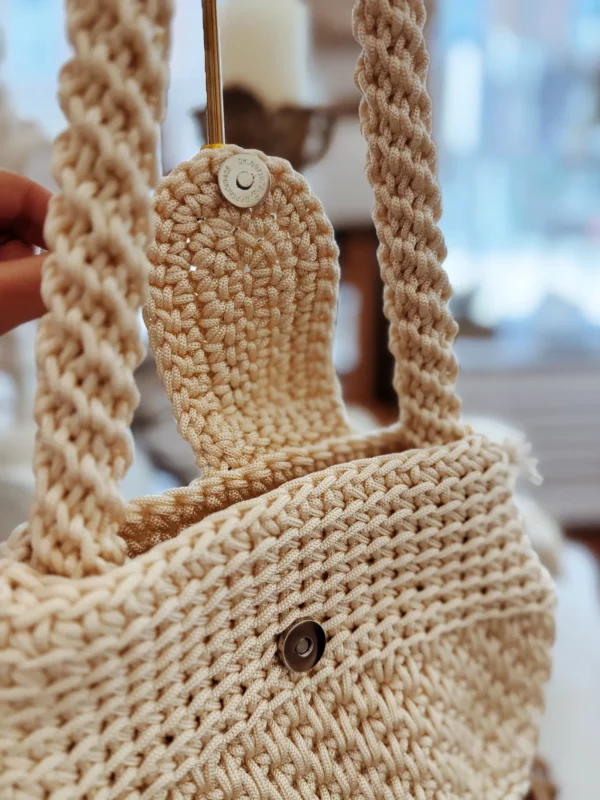 Sa grande anse permet de le porter confortablement à l’épaule, pour un porté à la fois pratique et élégant. Il se ferme grâce à un rabat avec bouton doré aimanté, qui assure une fermeture simple et discrète tout en ajoutant une note lumineuse.